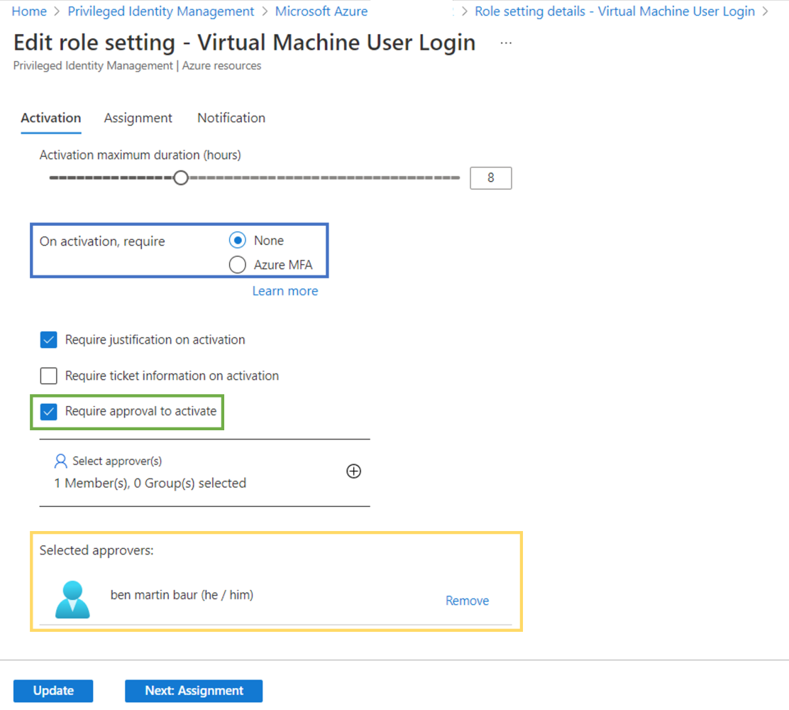 In the Settings menu, make sure you select “Require approval for activate” and select an approver. Additionally you can force MFA for the activation process.