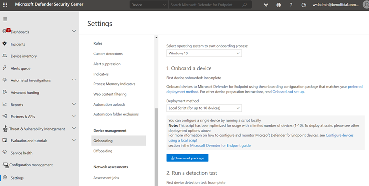 In the Microsoft Defender Security Center navigation pane, select Settings > Onboarding. - Select Windows 10 as the operating system.