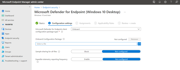 Optional: If you want to go crazy you can do the onboarding via MEM – select Endpoint Security and Create a device configuration profile to configure Microsoft Defender for Endpoint