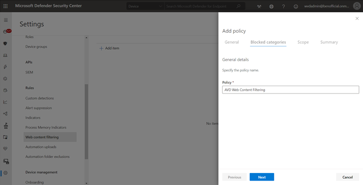 Web content filtering policies specify which site categories are blocked on which device groups. To manage the policies, go to Settings > Rules > Web content filtering.