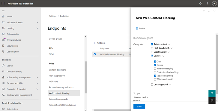 - Select the categories to block. Use the expand icon to fully expand each parent category and select specific web content categories.