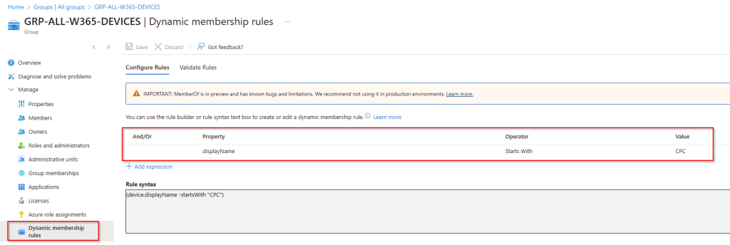 Next, define the dynamic membership rule so that only Windows 365 Cloud PC devices with a device.displayName -startsWith "CPC-" expression are added to the group.