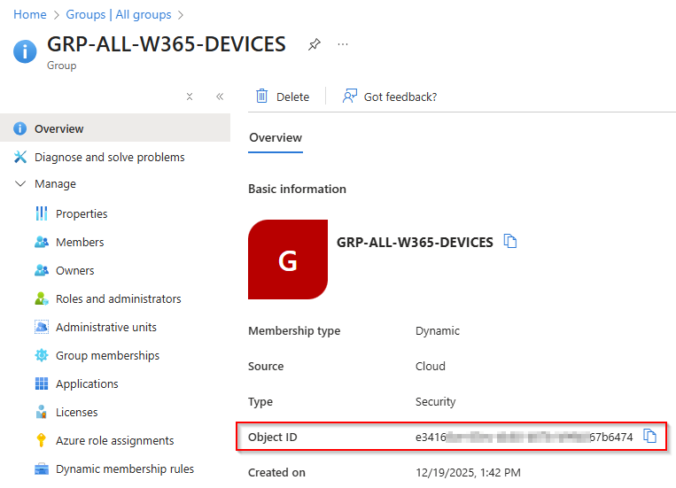 Copy the Device Group Object ID, as it will be required in the next steps.