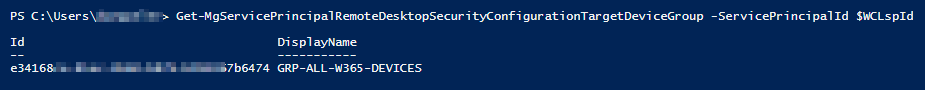 Get-MgServicePrincipalRemoteDesktopSecurityConfigurationTargetDeviceGroup -ServicePrincipalId $WCLspId