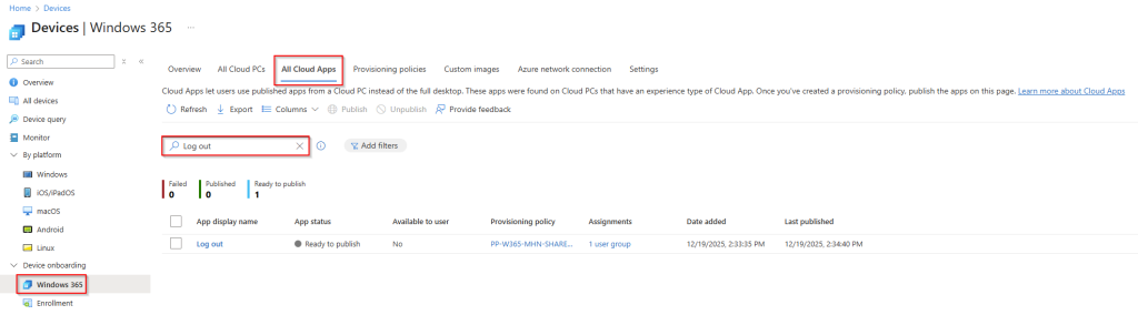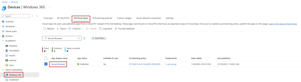 After the Reprovisioning runs successfully. Open the Intune Windows 365 management blade, then select the Cloud Apps tab to view all available Cloud Apps. Select the Cloud App for which you want to publish.
