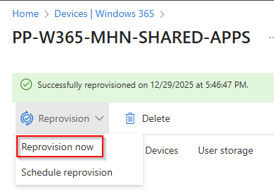 Now reprovision your Windows 365 Frontline Cloud PCs in shared mode so the service can load and publish the newly added Start Menu apps. You must enable the Provisioning Policy alongside your Device Preparation Policy.