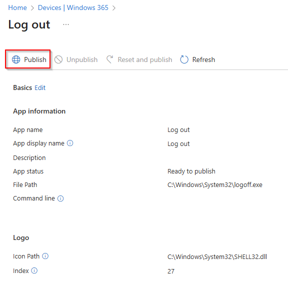 After the script runs successfully. You can publish or republish your Cloud App with the new custom icon directly in Intune. Open the Intune Windows 365 management blade, then select the Cloud Apps tab to view all available Cloud Apps. Select the Cloud App for which you want to change the icon.